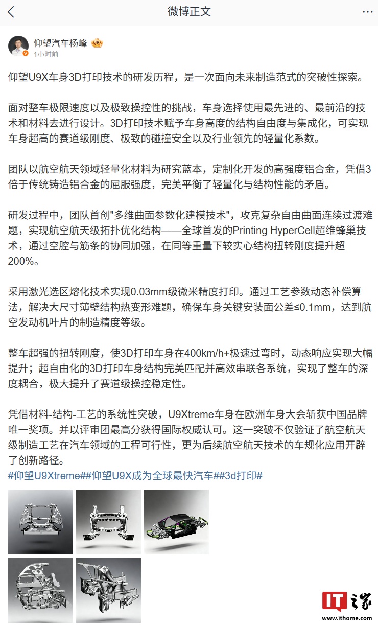 U9Xtreme的3D打印车身在400km/h+的极速过弯时展现出卓越的动态响应,其超自由化的车身结构与各系统完美匹配,提升了赛道级操控稳定性。这一技术突破不仅在欧洲车身大会上为中国品牌赢得了唯一奖项,还以最高分获得了国际权威认可,为航空航天技术在汽车领域的应用开辟了新路径。