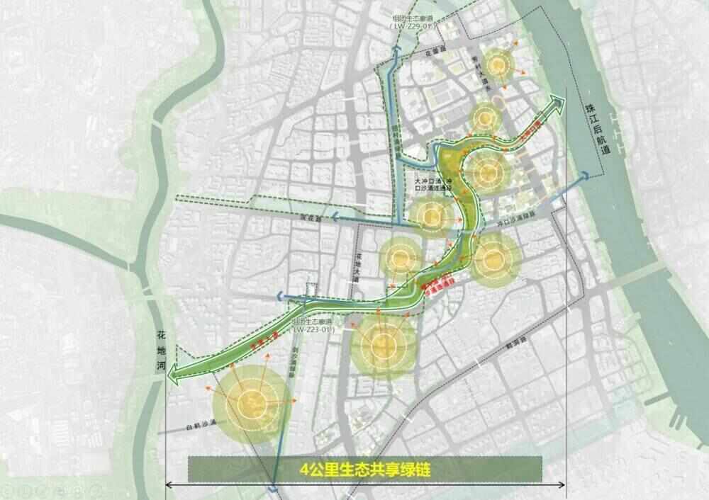 其中,4公里长的生态共享绿链连通珠江后航道和花地河,将重塑江岸、涌岸、路岸的生态景观。