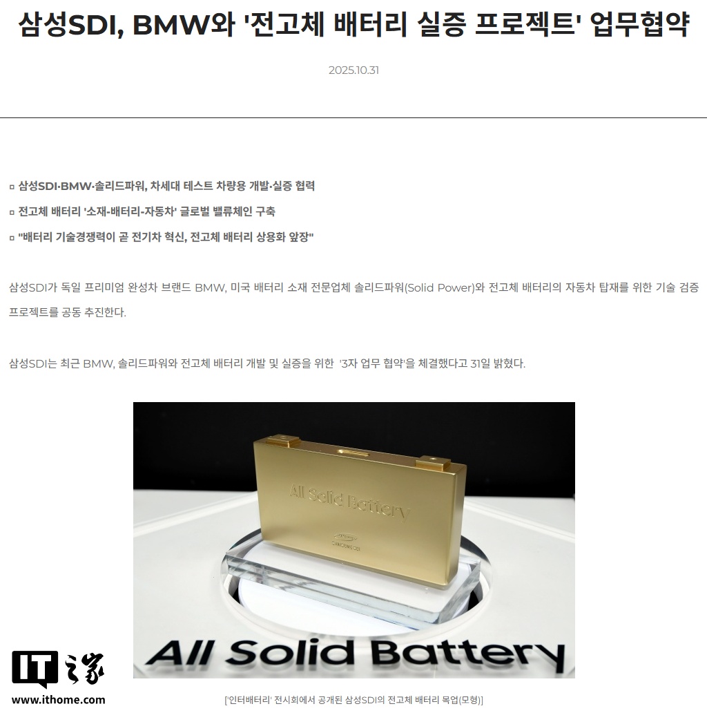 10月30日,三星SDI宣布与宝马和Solid Power签署三方业务协议,共同推进全固态电池车载技术验证项目。三星SDI将利用Solid Power开发的固态电解质,提供能量密度和安全性更高的全固态电池电芯;宝马则计划在此基础上开发全固态电池模组与电池包,并开展验证工作。三方的最终目标是在宝马下一代测试车辆上搭载全固态电池,验证其实际性能。