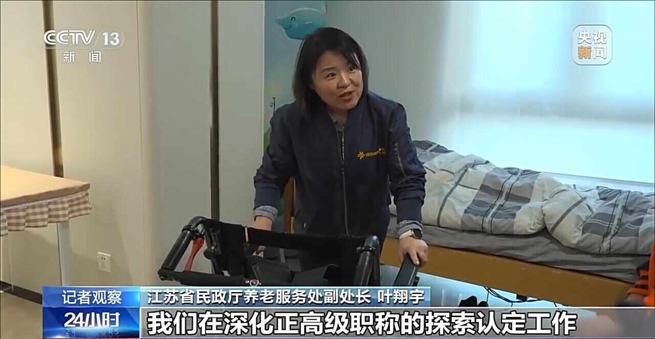 江苏省民政厅养老服务处副处长 叶翔宇:我们还建立了养老护理职称的补贴制度,同时获得养老护理员职业技能认定和职称评定的人员,能够一定程度上浮岗位津贴。在目前在确定初级、中级和副高级三个层次的基础上,我们在深化正高级职称的探索认定工作。下一步,我们将打造一个完整的职称体系,能够让更多的年轻人有意愿参与到我们养老服务领域工作当中。