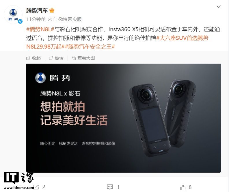 此外,腾势N8L还与影石相机展开深度合作,Insta360 X5相机可以灵活布置于车内外,并通过语音控制实现拍照和录像功能。这一合作进一步丰富了腾势N8L的智能互联功能,提升了用户体验。通过这些合作,腾势N8L不仅在智能驾驶和家居控制方面有所突破,也在车载娱乐和摄影方面展现了创新能力。