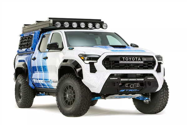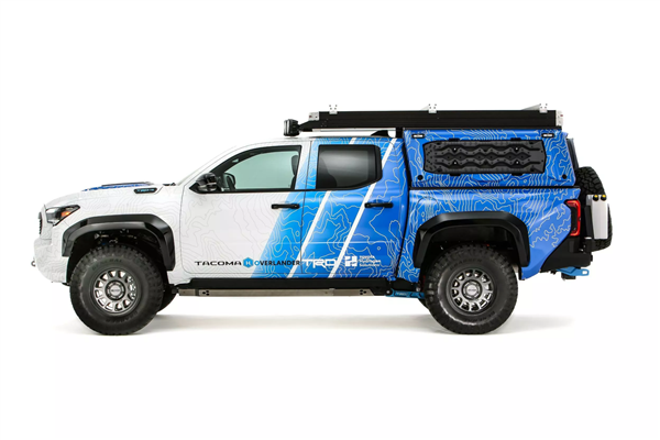 近日,丰田推出了一款氢动力版的皮卡概念车,基于越野版中型皮卡Tacoma(塔科马)打造。这款氢动力皮卡采用了白蓝色涂装,设计灵感来源于早期的H2概念车,并拥有新的车轮、加高的车身以及越野后保险杠、救援点、绞盘和额外LED灯等外部设计。后车厢配备了可弹出的车顶帐篷和三面开启的后篷,使其能够变身为一辆完全自给自足的越野车。