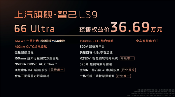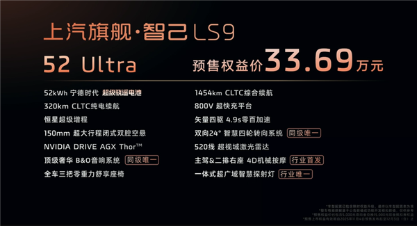 智己LS9搭载520线激光雷达和英伟达Thor辅助驾驶芯片,支持城市NOA、高速NOA等功能。配备灵蜥数字底盘3.0,具备智慧四轮转向能力,转弯半径4.95m,搭载MK C2线控制动系统,实现100%制动能量回收。动力方面,采用“恒星”超级增程系统,1.5T发动机与电动机组合,最大综合功率390千瓦,综合扭矩670N·m,零百加速4.9秒,油电综合能耗2.81升/百公里。提供52kWh和66kWh电池组,CLTC纯电续航402公里,综合续航1508公里,全系标配800V碳化硅平台,支持10分钟补能150km和6.6kW V2L外放电。预计明年初还将推出Hyper版,具备线控转向和高性能三电机矢量四驱系统,零百加速提升至3秒级。