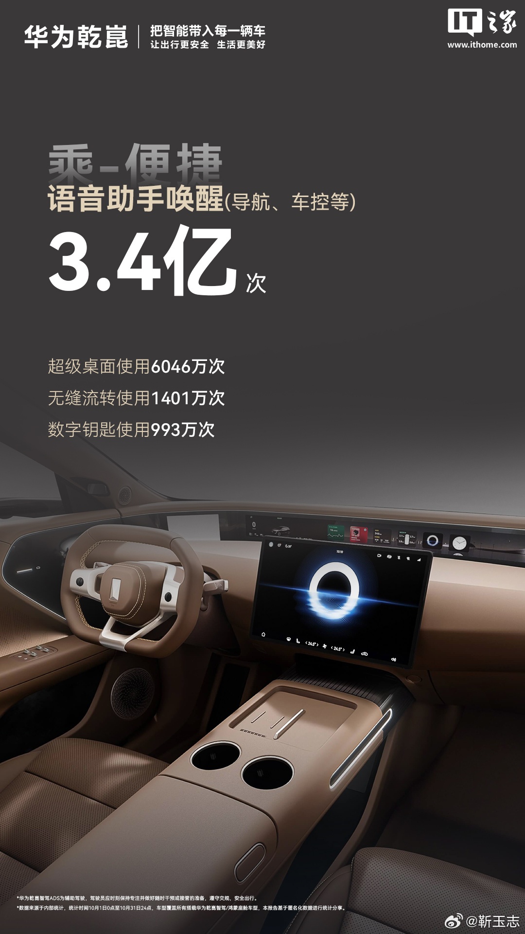 华为智能汽车解决方案BU CEO靳玉志近日分享了华为乾崑用户的10月出行报告。报告显示,华为乾崑辅助驾驶里程在10月新增6.81亿公里,相当于绕赤道1.7万圈。同时,语音助手被唤醒了3.44亿次。此外,华为乾崑辅助驾驶系统在10月主动避免可能的碰撞26.4万次,分神监测提醒1.1亿次,泊车辅助使用3657万次。