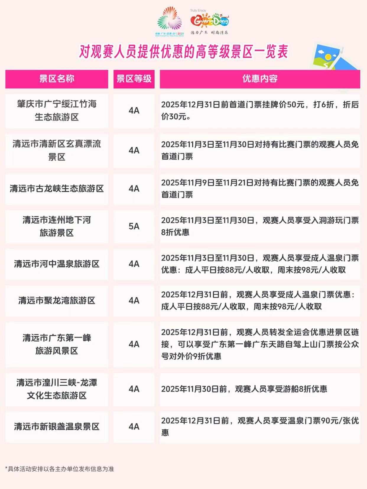 为营造“全民全运、共享盛事”的良好氛围,全省超过100家4A级以上旅游景区和省级以上旅游度假区同步面向观赛游客推出形式多样的游览优惠,包括门票折扣、联票套餐及特色体验活动,让广大观众在观赛之余,能够轻松畅游广东,深入感受岭南文化的独特魅力。活动期间,各地还将发布本地区优惠景区名单。我们诚挚邀请各地运动员与游客在这个冬天走进广东,在温暖气候与诚意礼遇中,共赴一场“看全运、游广东”的难忘旅程。