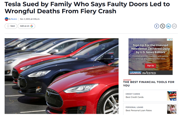 11月5日,特斯拉因隐藏式门把手可能带来的安全隐患在美国面临诉讼和调查。去年11月,一辆Model S在碰撞后车门无法开启,导致车内五名乘客被困火海中不幸遇难。遇难者亲属提起诉讼,指控车门锁止系统困住乘客无法逃生。美国国家公路交通安全管理局(NHTSA)已启动调查,收到16起关于2021款特斯拉Model Y车型的投诉报告,涉及车辆低压蓄电池故障导致车外门把手失灵。多起投诉案例中,特斯拉门把手故障导致儿童被反锁车内,需救援人员介入或破窗开启车门。