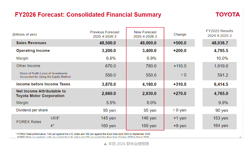 预计经营利润为3.40万亿日元(约合1576.21亿元人民币),此前预计为3.20万亿日元;预计净利润为2.93万亿日元(约合1358.32亿元人民币),此前预计为2.66万亿日元;预计销售净额为49.00万亿日元(约合2.27万亿元人民币),此前预计为48.50万亿日元。