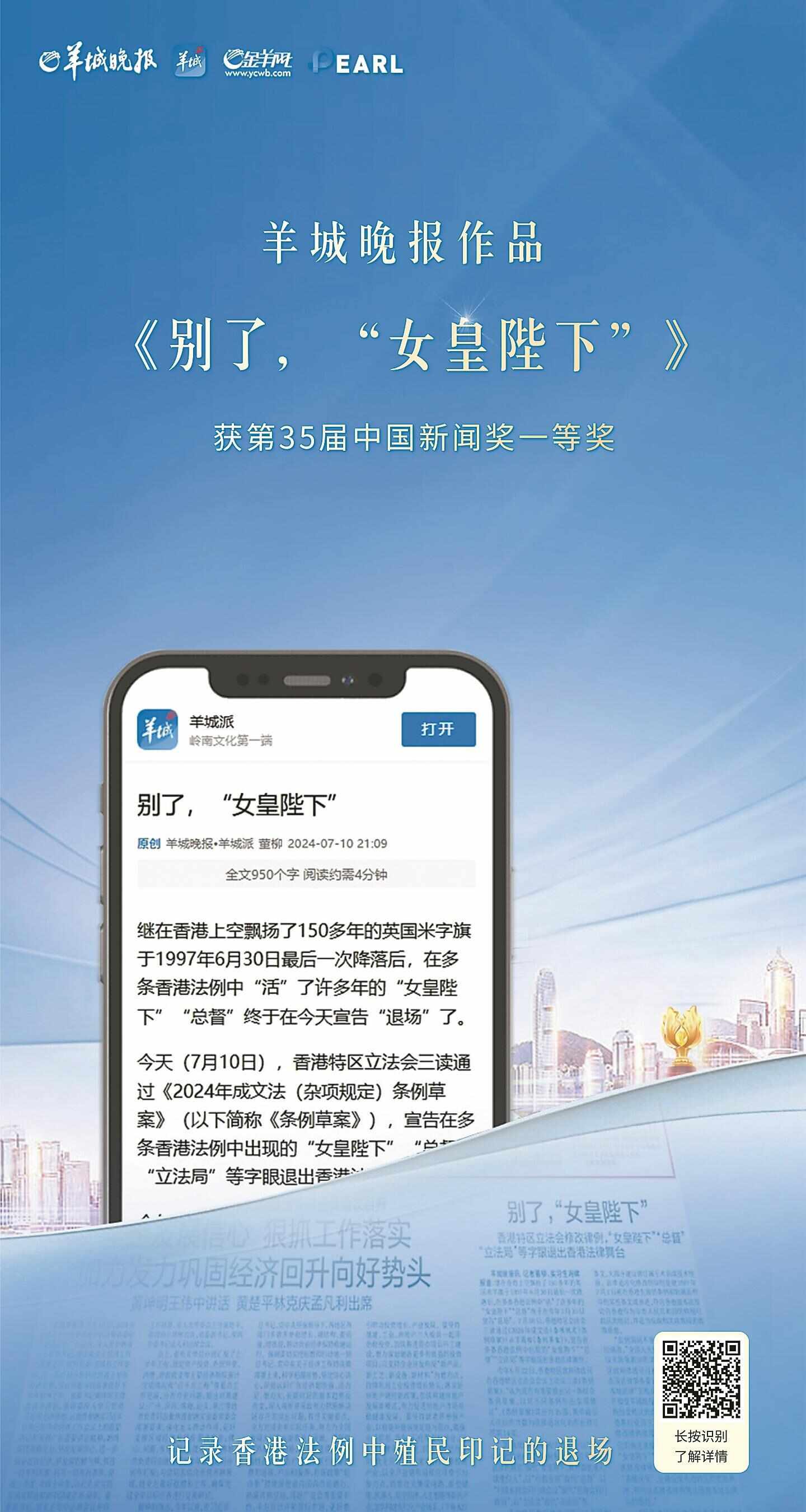 《别了,“女皇陛下”》(作者:董柳;编辑:林洁、黄丽娜、陈婉允)记录了2024年7月香港特别行政区立法会三读通过《2024年成文法(杂项规定)条例草案》,将存在了许多年的“女皇陛下”“总督”等字眼从多条香港法例中删除的历史性一幕。报道捕捉了香港回归祖国以来在法律制度上细微且重大的变化,宣告了香港推进法律制度“去殖民化”的历史进程,见证了香港法例中殖民印记的黯然退场和“一国两制”的稳步推进。报道被光明网、中新网等众多媒体(平台)转载。