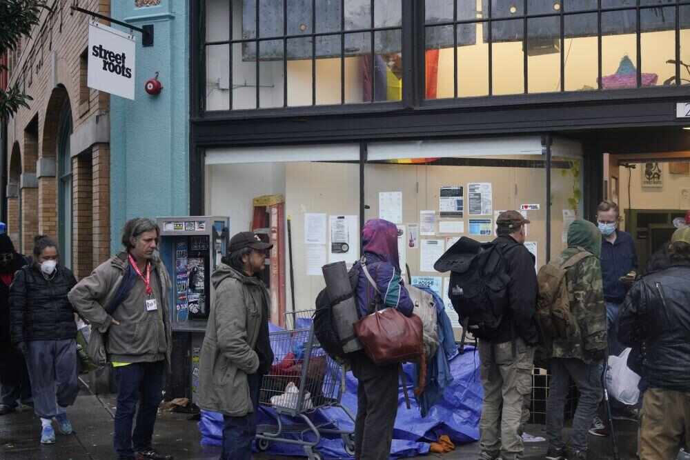 11月5日清晨,在美国波特兰的深秋寒意中,无家可归者排队等待领取救助物品。 新华社记者 吴晓凌 摄
