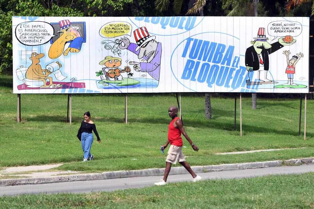 11月5日,在古巴首都哈瓦那,行人从谴责美国对古巴封锁的宣传牌前走过。宣传牌的蓝色大字写着“推翻封锁”,漫画讽刺美国对古巴封锁的荒谬性。 新华社发(华金·埃尔南德斯摄)
