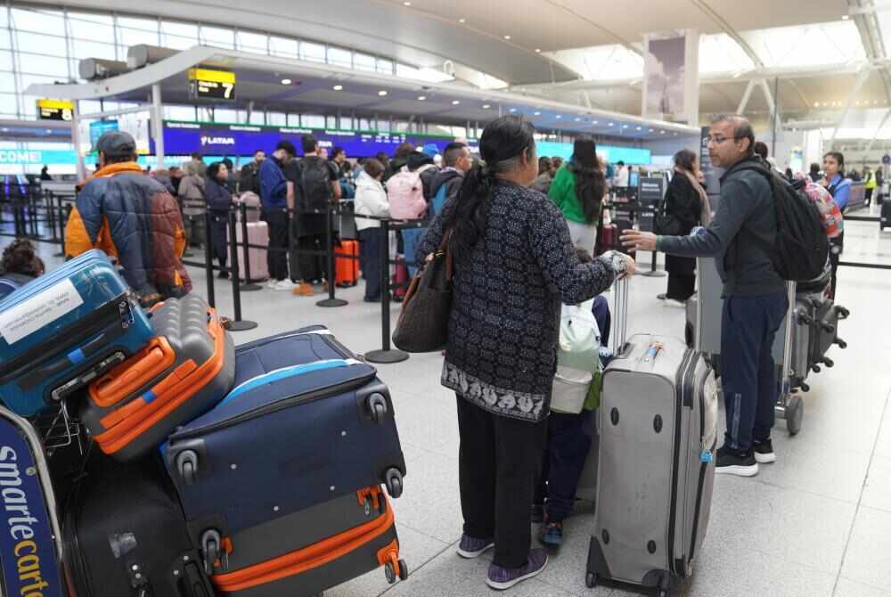 11月5日,在美国纽约肯尼迪国际机场,乘客排队值机。 新华社记者 张凤国 摄