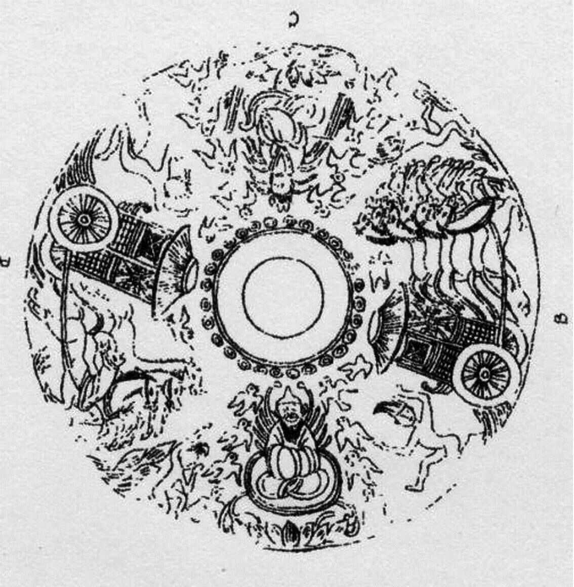 幸运的是,我们找到了一枚东汉画像镜,即浙江省博物馆收藏的一枚东汉车马神人画像镜。其无论是构图形式还是主体元素,都与这件仿制品高度一致。镜背主纹中的主要图像也是上下对称的两身坐姿人物和左右对称的两部车马(图3)。马车一望便知与仿制品的是同一类型:车厢皆为正方体,皆表现出清晰的车窗棂格,车厢顶篷皆呈椭圆形伞盖状,马车行驶的方向也一致。甚至两部对称的车马与水平线保持了一定斜度的做法二者也完全一致,而且倾斜的方向也完全一致。至于这枚铜镜的两身人物,分别为戴山形冠的东王公(上)和西王母(下)。最新的考古发现表明,作为男性的“阳仙”东王公与作为女性的“阴仙”西王母对应的传说及其图像组合模式,在西汉宣帝(前74—前48年在位)时期,即公元前1世纪前期,已经成型(刘子亮、杨军、徐长青《汉代东王公传说与图像新探——以西汉海昏侯刘贺墓出土“孔子衣镜”为线索》,《文物》2018年第11期),东汉时期进一步流行。东王公与西王母上下对称布局,以及皆呈坐姿的做法,都与仿制品的一致,仿制品的原件仅仅将东王公与西王母置换成了佛陀和老子。