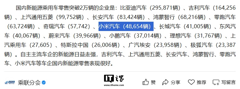 11月10日,小米汽车官方微博宣布,2025年10月小米汽车交付量持续超过40000台。根据乘联分会公布的数据,小米汽车新能源乘用车零售销量达到48654辆,其中小米YU7车型批发销量超过33662辆,已超过特斯拉Model Y。特斯拉10月批发销量为6.15万辆,包含出口3.54万辆,实际国内销量为2.6万辆。