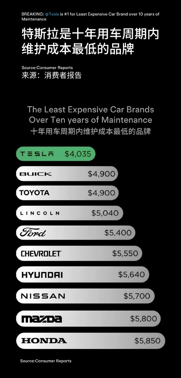 今日,特斯拉副总裁陶琳发文强调了特斯拉在维护成本上的优势。根据美国权威消费评测机构“消费者报告”的调查,特斯拉在10年用车周期内的维护成本为4035美元,是成本最低的品牌。这一数字远低于排名第二的别克汽车的4900美元,以及维修成本最高的本田汽车的5850美元。