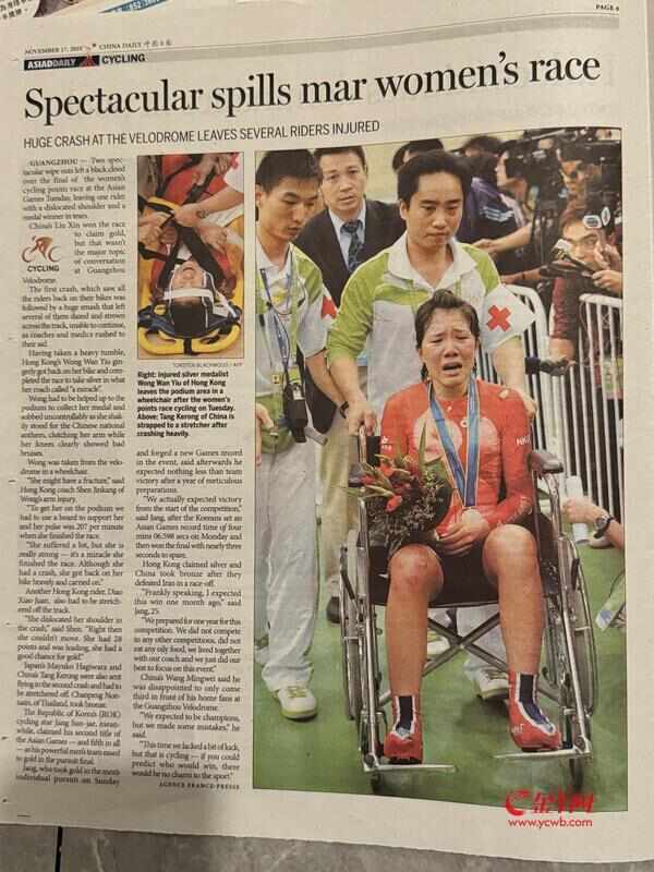 当年亚运会自行车场地积分赛在广州大学城进行,比赛进行到第四十九圈,黄蕴瑶正在为下一圈的冲刺抢位。“速度已经拉起来,突然一下就摔了。”她清晰记得,自己是第一个摔倒的,随后四、五台自行车接连碾过她的身体。场地自行车没有刹车,脚踏与鞋卡死,她只能躺在赛道上,眼睁睁看着后续车辆迎面撞来。