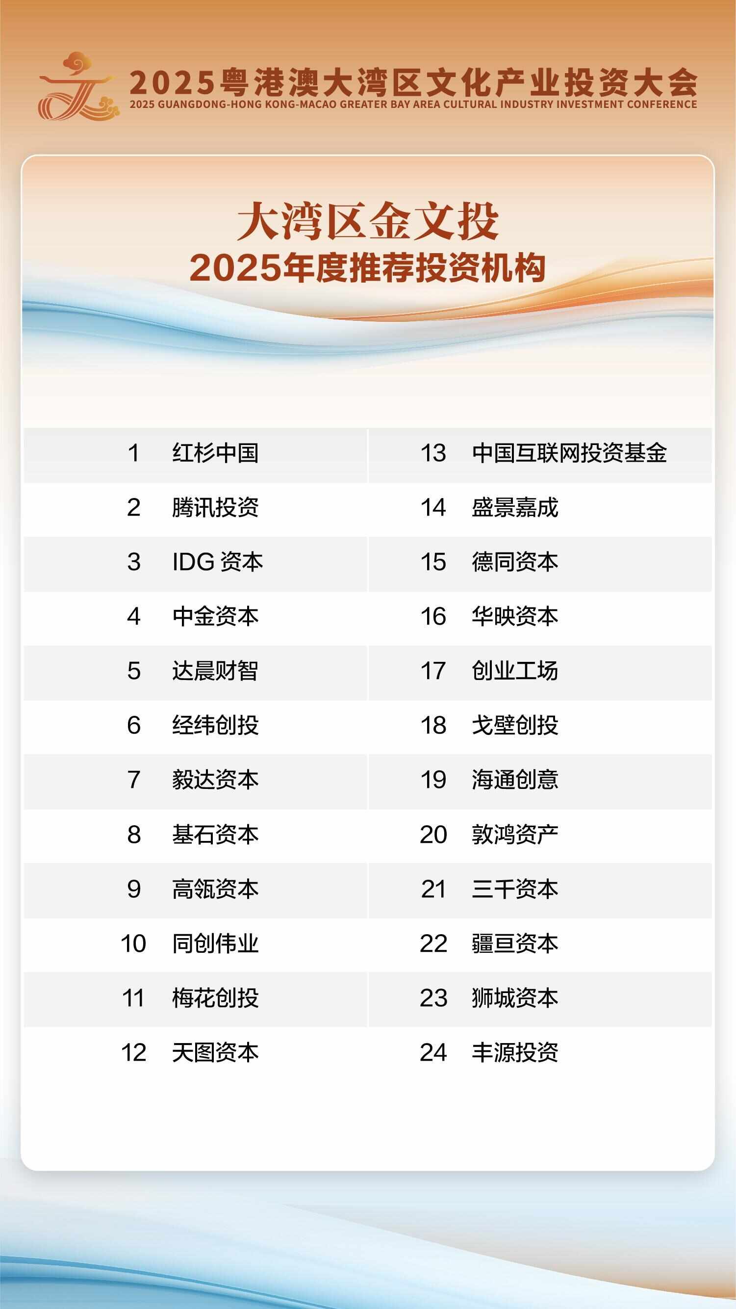 大湾区文投会高水平搭建“为资金找项目,为项目找资金”平台,吸引超过100家知名金融投资机构的200多名投资人到会。本次评选立足湾区,面向全国,对重点投资文化产业领域的200多家投资机构按照基金规模、投资项目数量及文化产业投资成功案例等规则进行筛选,最终选出24家投资机构为“大湾区金文投2025年度推荐投资机构”。
