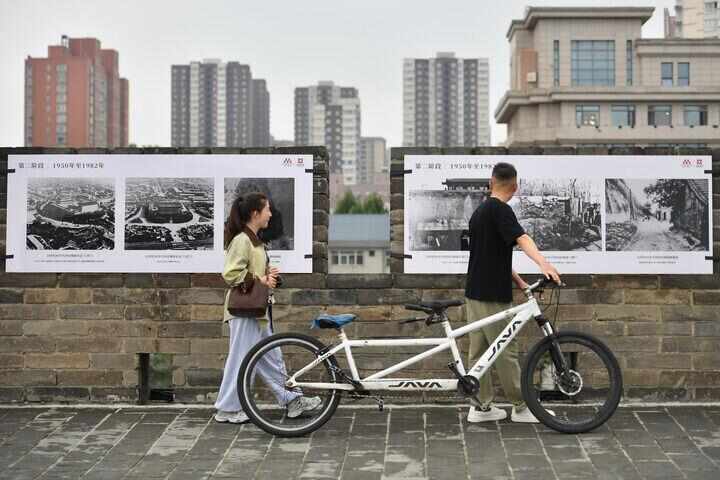 游客在西安城墙上参观以城墙保护为主题的图片展(2025年9月10日摄)。新华社记者 邵瑞 摄