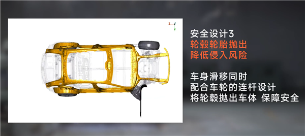 在小偏置碰撞中,小米YU7的安全结构设计发挥了重要作用。副车架牛角、前舱上边梁、铸铝塔顶和一体式三角梁等结构与障碍物形成反作用力,使车身能够“滑”过障碍物,从而降低乘员舱的碰撞冲击。同时,车身滑移时车辆会触发制动策略,减少二次碰撞的风险。在极端情况下,小米YU7的车轮连杆设计能够在碰撞能量极大时将轮毂轮胎抛出车体,避免轮毂侵入乘员舱,这一策略被称为“丢轮保命”,之前沃尔沃等品牌也有采用。