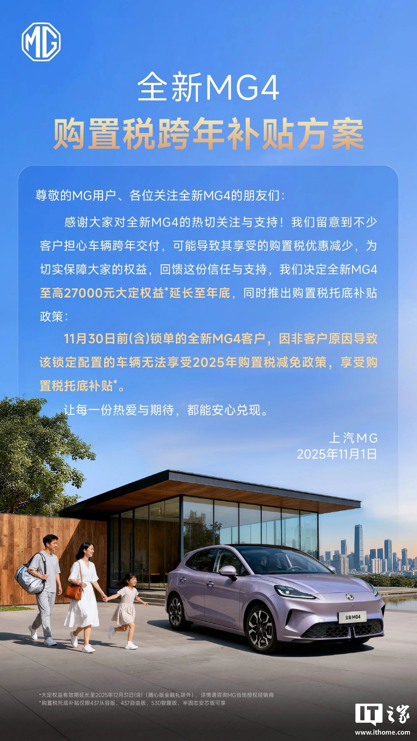 今日,上汽MG宣布全新MG4汽车购置税托底补贴政策延期,原定于11月30日结束的政策将延长至12月28日。此次政策调整主要针对锁定全新MG4 437从容版、437自由版、530智趣版、半固态安芯版的客户,若因非客户原因导致无法享受2025年购置税减免政策,将享受购置税托底补贴。此外,上汽MG还宣布全新MG4至高27000元大定权益延长至年底。