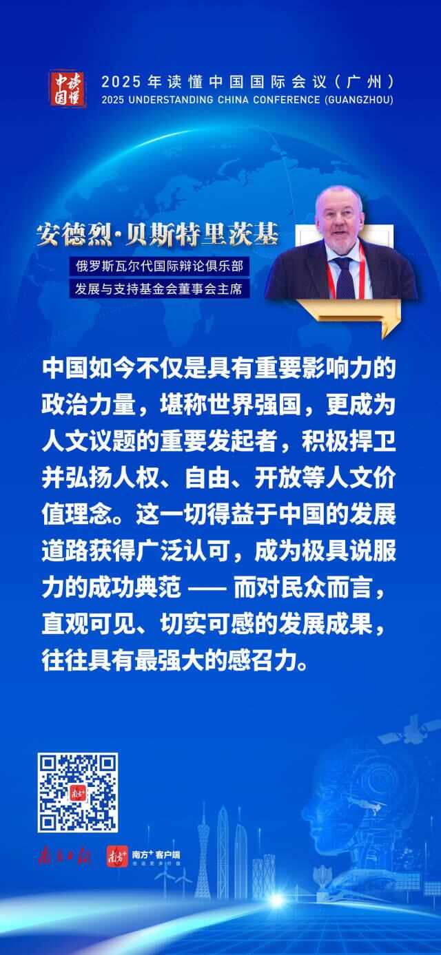 12月1日上午,2025年“读懂中国”国际会议开幕式在广州举行。在大会演讲环节,俄罗斯瓦尔代国际辩论俱乐部发展与支持基金会董事会主席安德烈·贝斯特里茨基表示,中国式现代化的一个关键特征,是其已崛起为具有关键影响力的全球性大国。国内发展所取得的卓越成就,为其拓展国际影响力铺平了道路,使中国得以凭借自身的行动议程与独特发展模式,为推动人类共同发展发挥建设性作用。