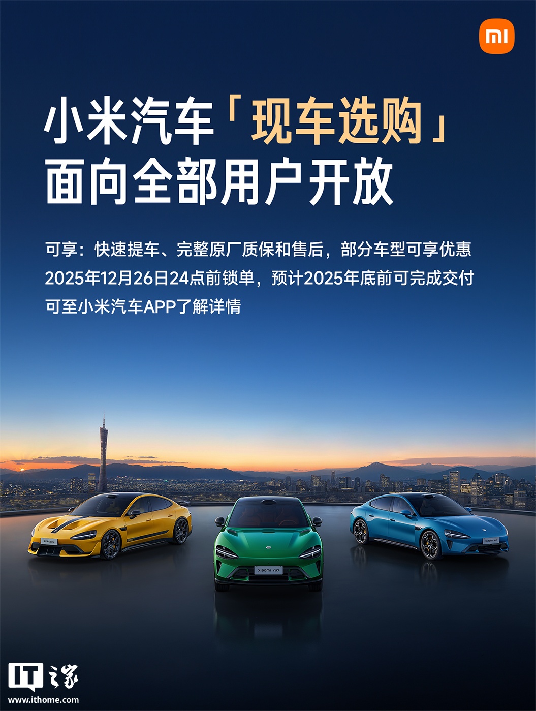12月3日,小米汽车官方宣布推出“现车选购”功能,并于今日上午10点向所有用户开放。该功能允许用户享受快速提车服务、完整的原厂质保和售后服务。对于部分车型,用户还可以享受优惠,只要在2025年12月26日24点前完成锁单,预计可在2025年底前完成交付。此外,12月1日12点起,已锁单但未交付的用户可以优先选择同车型的现车进行改配。