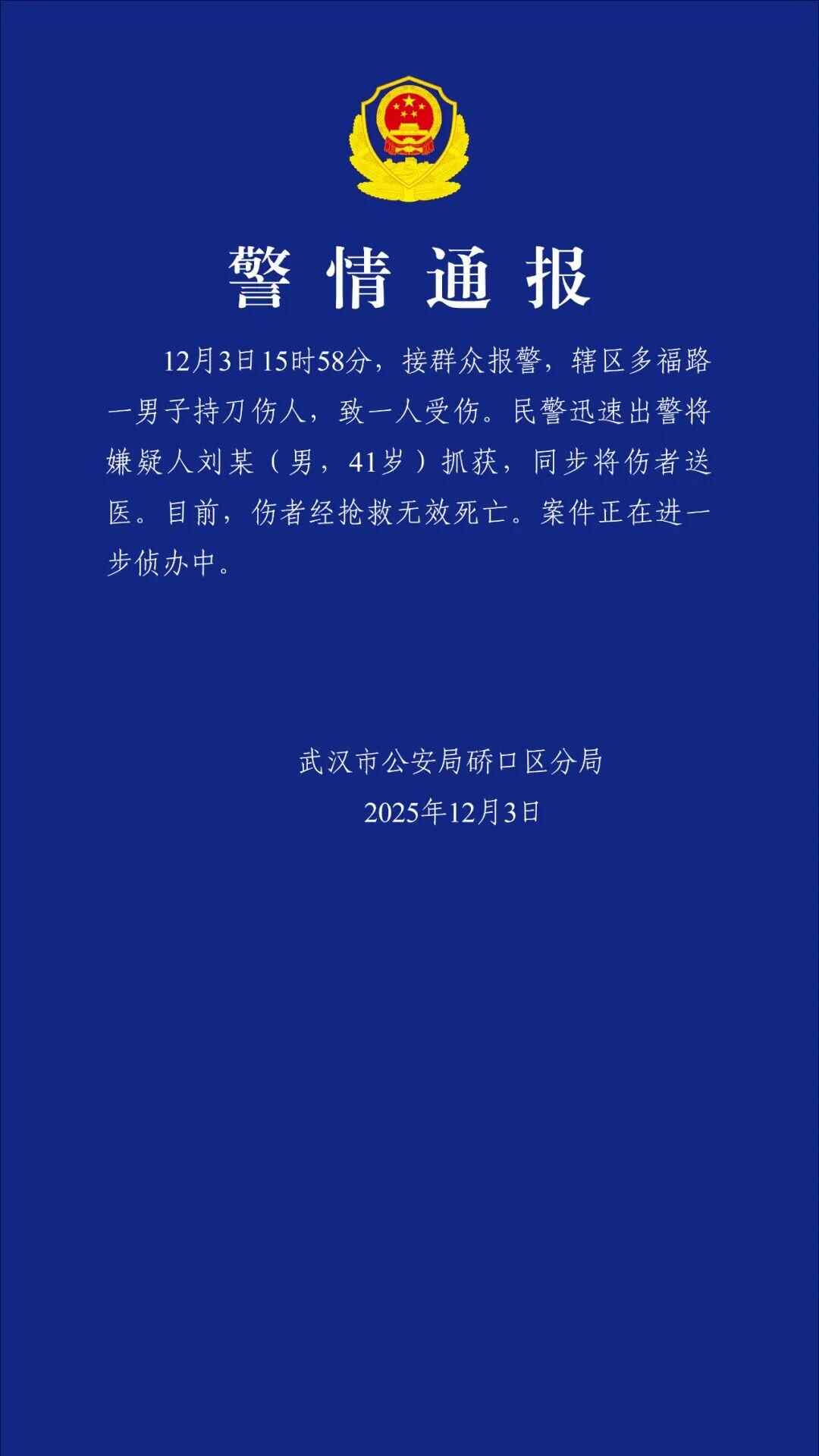 12月3日15时58分,接群众报警,辖区多福路一男子持刀伤人,致一人受伤。民警迅速出警将嫌疑人刘某(男,41岁)抓获,同步将伤者送医。目前,伤者经抢救无效死亡。案件正在进一步侦办中。