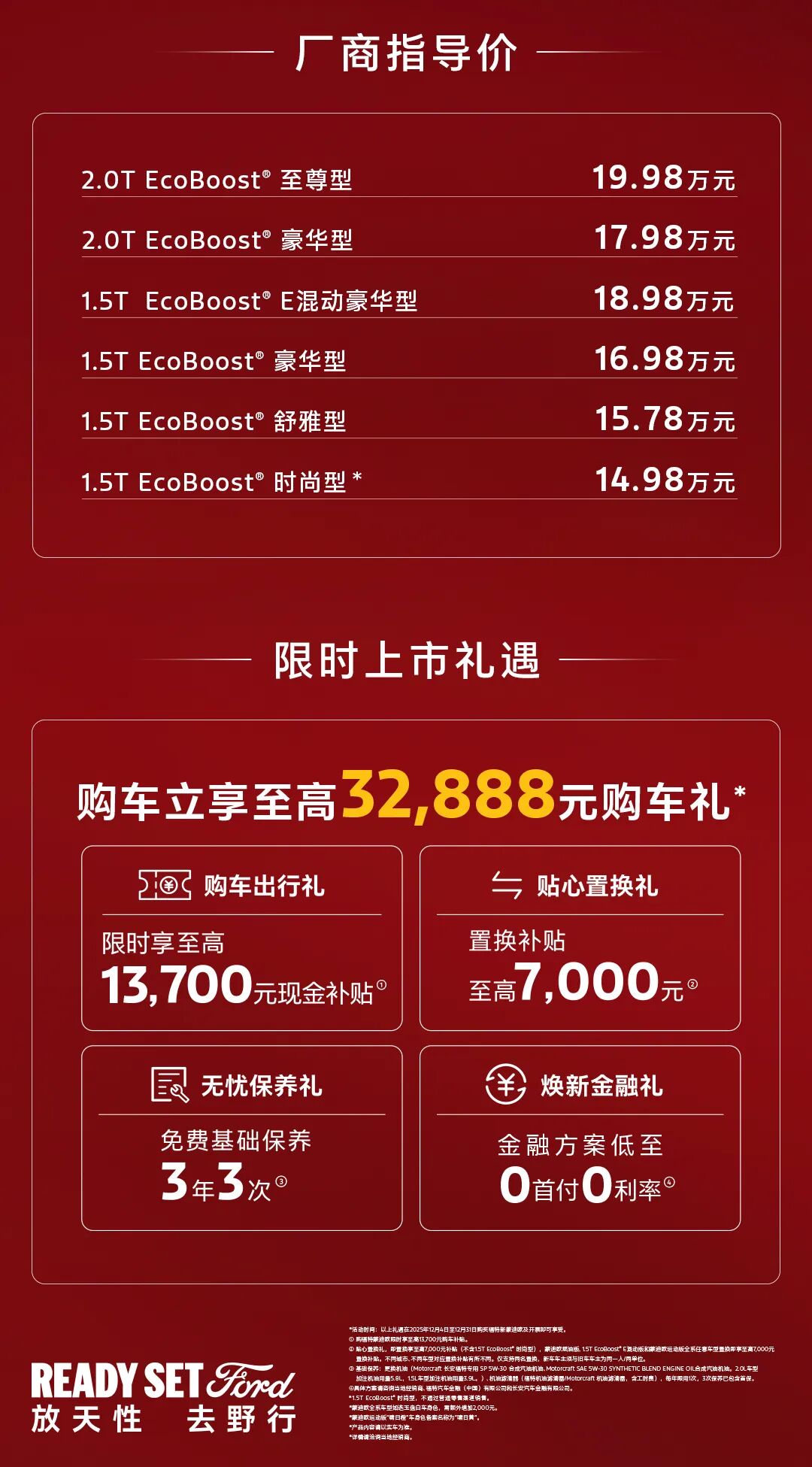 12月4日,长安福特宣布新蒙迪欧正式上市,新车提供1.5T和2.0T两种动力版本,共6款配置,售价区间为14.98万至19.98万元。新蒙迪欧在设计上采用低趴宽体风格,前脸继承福特经典设计,配备全新大气进气格栅。车身侧面展现动感溜背式造型,车窗、车顶、外后视镜均采用黑色涂装,并配备隐藏式门把手。尾部则融入“三柱型”元素的尾灯设计。