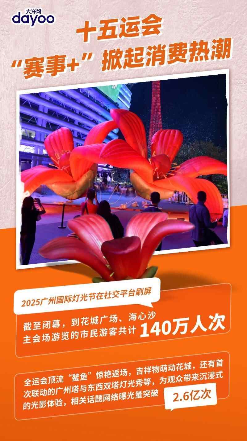 “白天赏花、夜晚观灯、全天享赛”!11月以来,第十五届全国运动会吸引着八方宾朋,给广州带来了巨大的经济“流量”。此外,2025年广州国际灯光节、广州国际车展等活动接踵而至,市民游客在广州既能感受体育赛事氛围,又能享受美食、美景、购物的快乐。这些集吃、住、行、游、购、娱于一体的体育赛事消费新场景,恰恰是广州消费市场从“点”到“面”、从“量”到“质”升级的生动写照。一组海报,看“赛事+”掀起消费热潮。