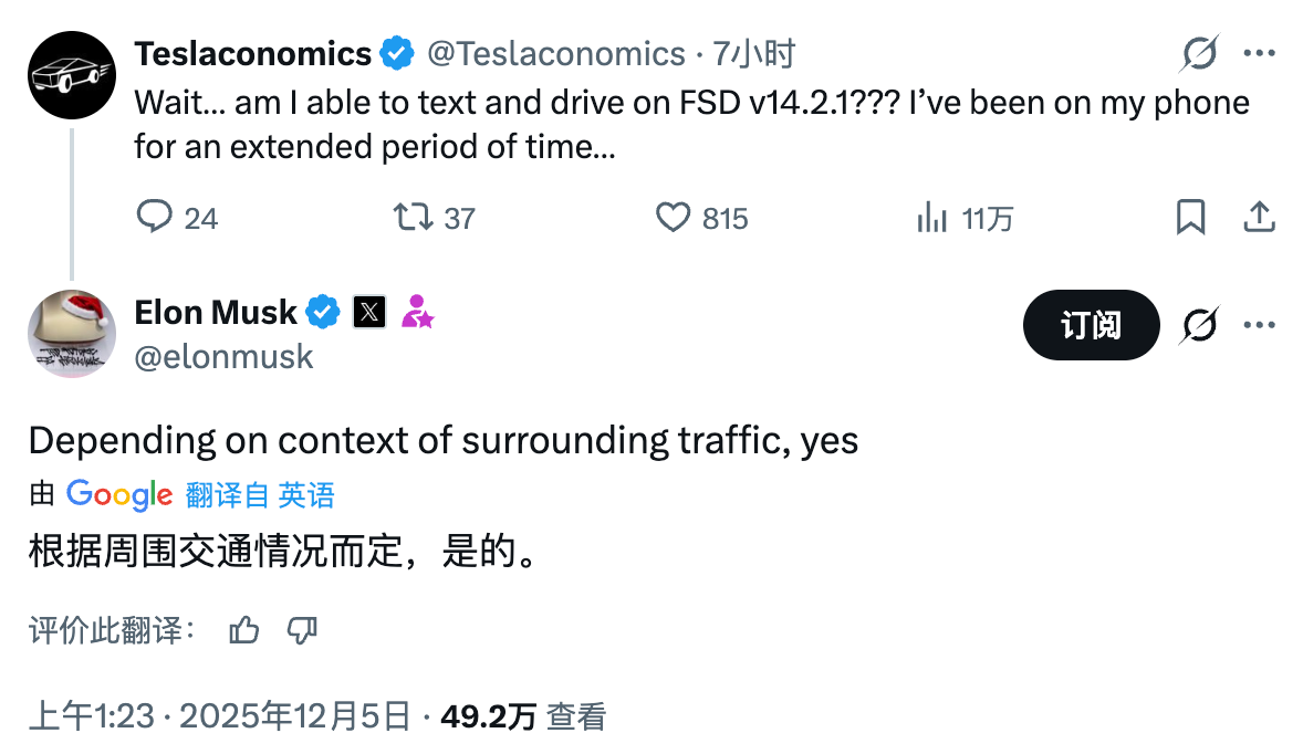12月5日,特斯拉推出了全自动驾驶系统(FSD)的更新,该更新允许车主在自动驾驶模式下发送短信。特斯拉CEO埃隆·马斯克确认,最新FSD系统在特定场景下允许车主边开车边发短信,具体取决于周围交通状况。美国《商业内幕》杂志的撰稿人艾利斯塔·巴尔通过实测,体验了特斯拉Model 3在FSD系统v14.2.12025.38.9.6版本下的自动驾驶功能,并在自动驾驶过程中发送消息。