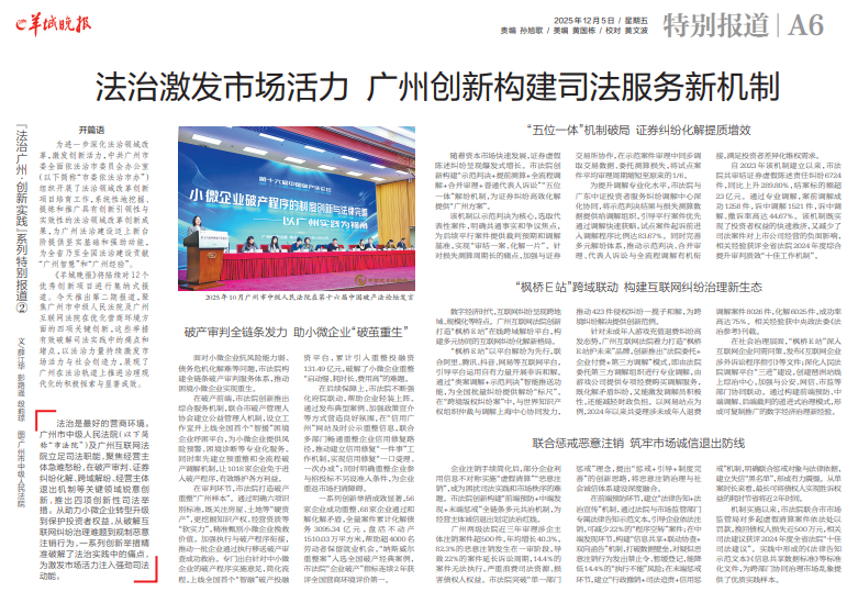 《羊城晚报》将陆续对12个优秀创新项目进行集纳式报道。今天推出第二期报道,聚焦广州市中级人民法院及广州互联网法院在优化营商环境方面的四项关键创新,这些举措有效破解司法实践中的痛点和堵点,以法治力量持续激发市场活力与社会创造力,展现了广州在法治轨道上推进治理现代化的积极探索与显著成效。