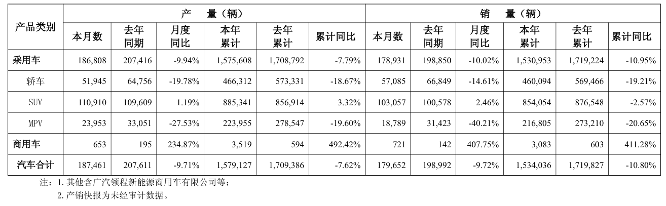 今日,广汽集团发布了2025年11月份的产销快报。11月汽车产量为187,461辆,同比下降9.71%,本年累计产量为1,579,127辆,同比下降7.62%。11月汽车销量为179,652辆,同比下降9.72%,本年累计销量为1,534,036辆,同比下降10.80%。在品牌销量方面,广汽本田和广汽丰田11月销量保持稳定,分别同比增长5.68%和0.68%。然而,广汽传祺11月销量大幅下滑,同比下降42.04%,销量为25,739辆。广汽埃安11月销量同比下降9.4%,销量为38,326辆。