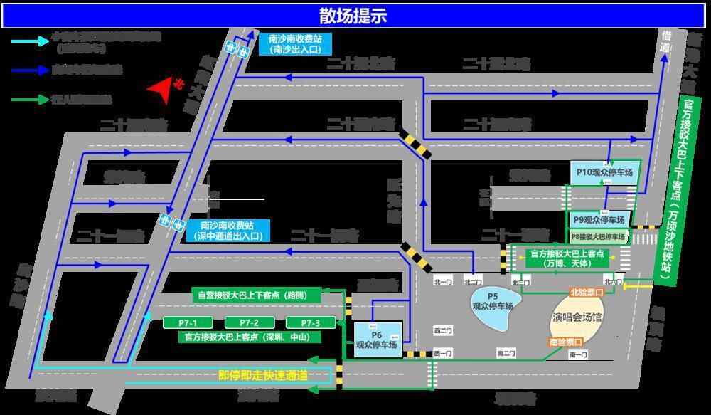 现场将根据目的地设置不同上车点,观众可根据指引在对应地点排队,人满即走,滚动发车。其中,前往万顷沙地铁站方向的专线最晚发车时间约为22:15,其他线路最晚发车时间约为23:00。