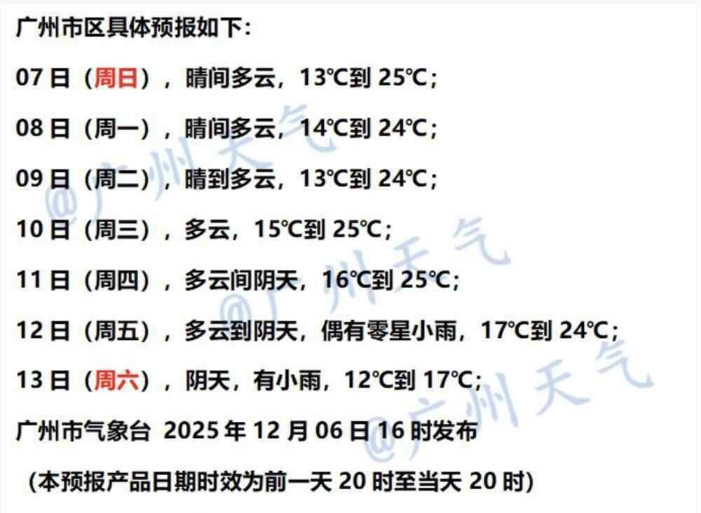 结合广州市气象台12月6日发布的广州市未来十天天气趋势预报和建议,以及6日傍晚市区七天预报,预计7至9日,广州晴间多云,最低气温13~14℃,最高气温24~25℃,天气干燥。预计10日至12日,广州云量逐日增多,最低气温上升。