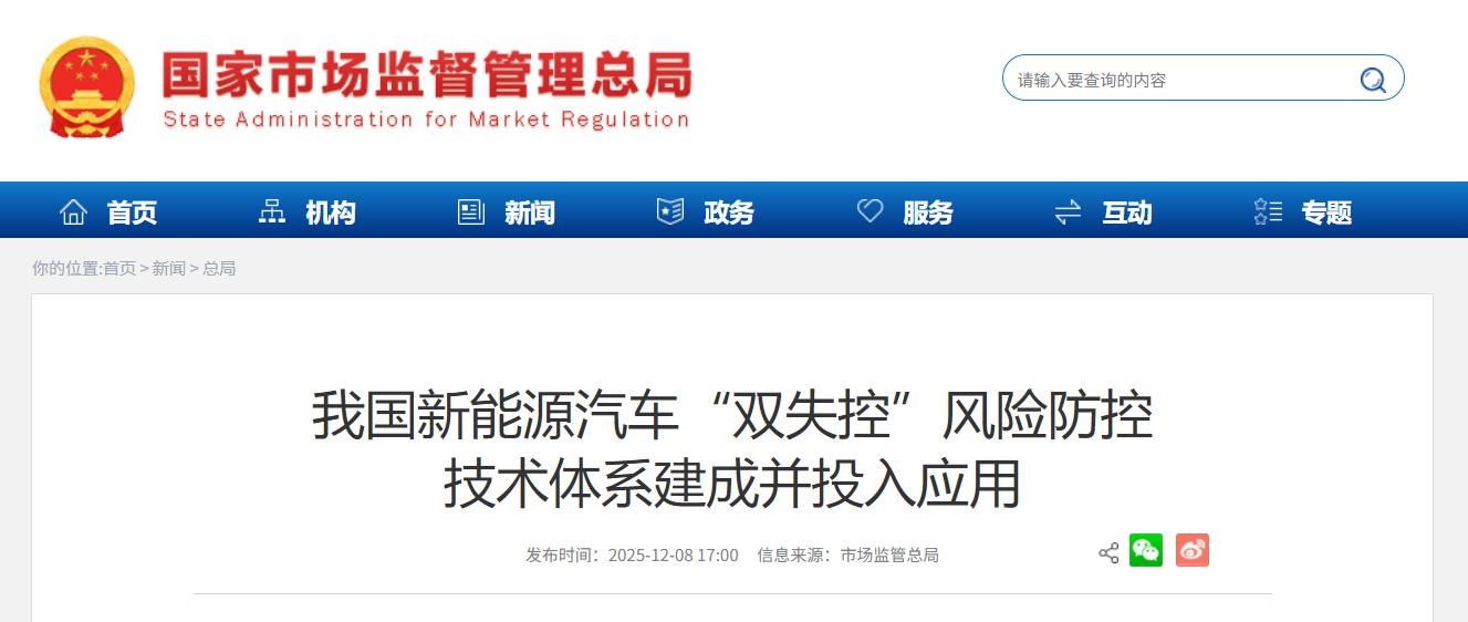 今日,国家市场监管总局官网发布消息,针对新能源汽车热失控和速度失控的“双失控”问题,总局已构建起一套风险防控技术体系并投入应用。该体系通过“双失控”事故深度调查与缺陷判定技术研发,结合“线上预警+线下检测”的风险防控机制,以及“新能源汽车智慧监管云平台”的统筹赋能,旨在提升召回监管科学化水平,保障消费者安全。