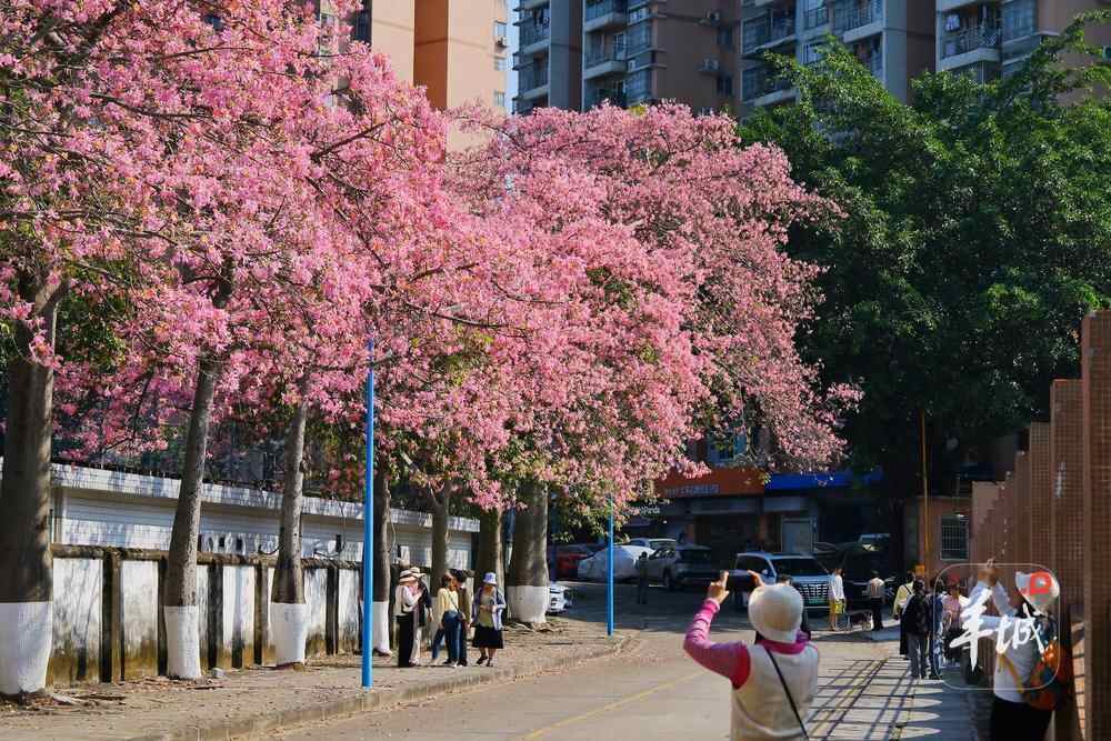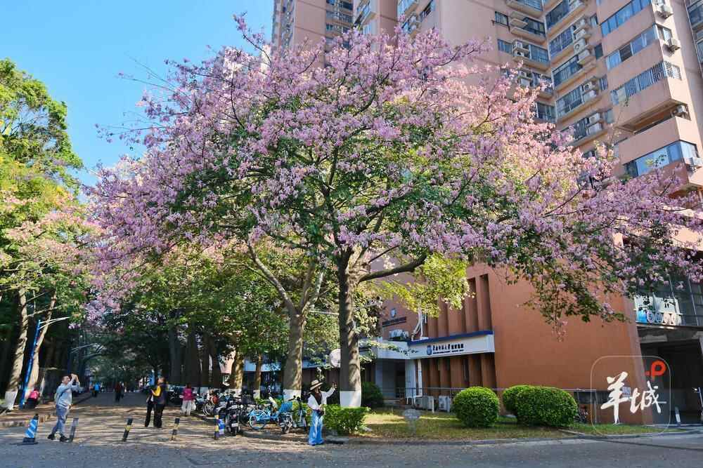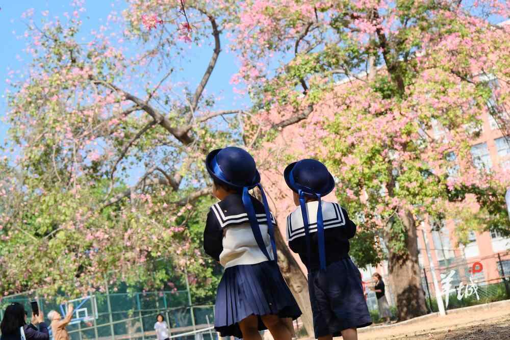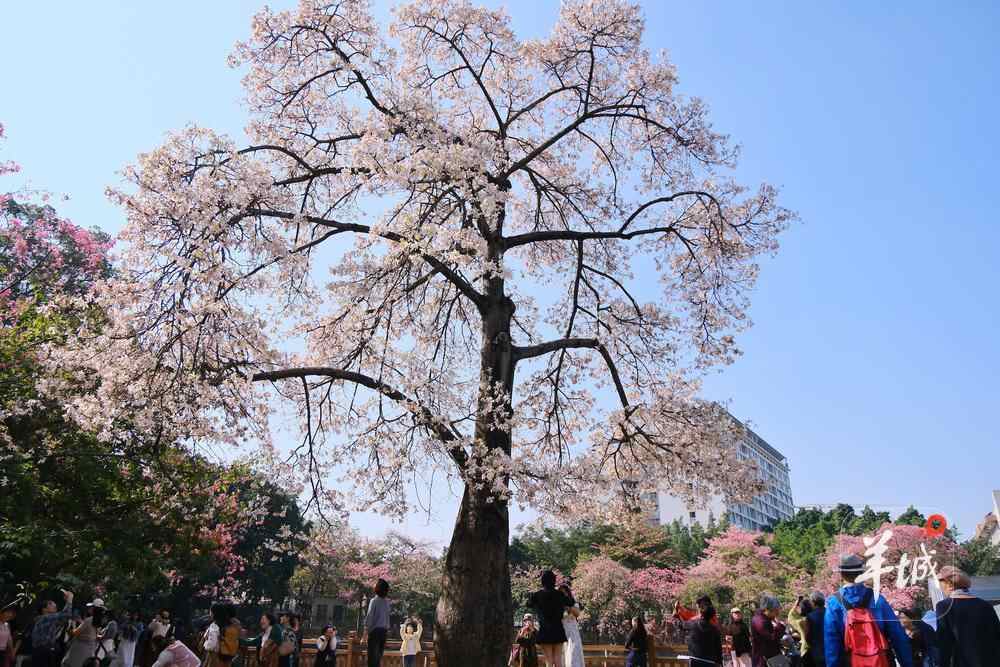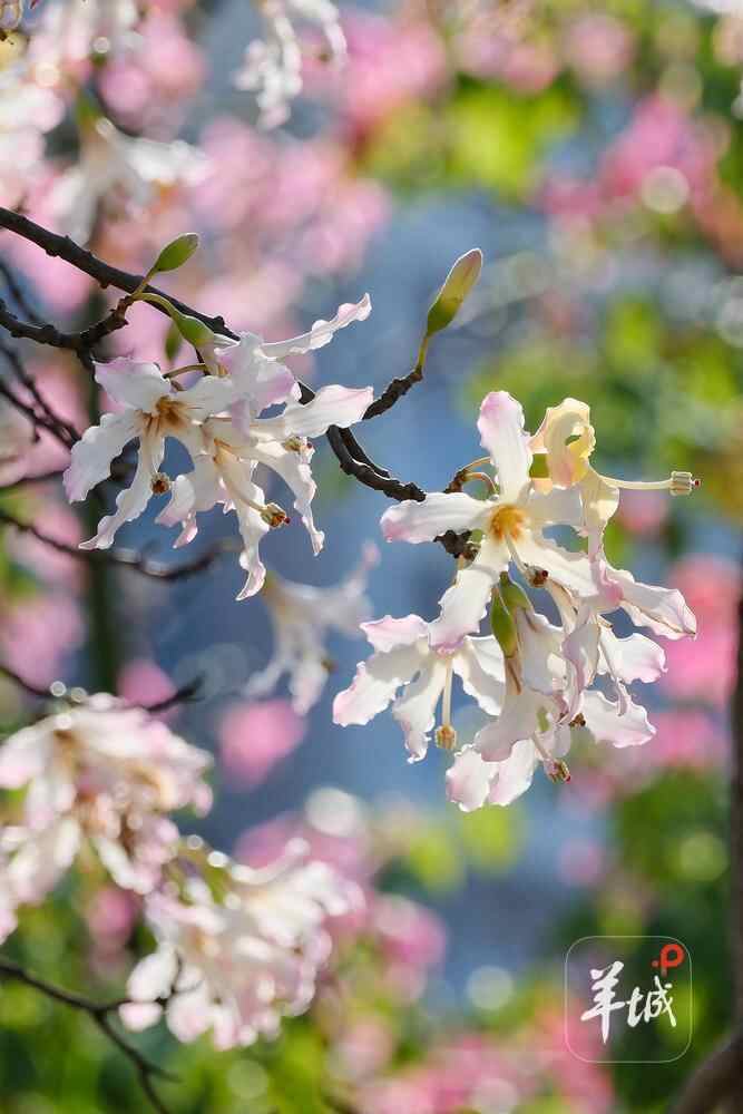 近日,广州冬日阳光明媚,华南师范大学校园内的异木棉迎来盛花期,粉白相间的花朵如云似霞,为冬日的校园增添了一抹浪漫色彩。其中一株纯白异木棉格外引人注目,成为市民和摄影爱好者争相打卡的“网红树”。