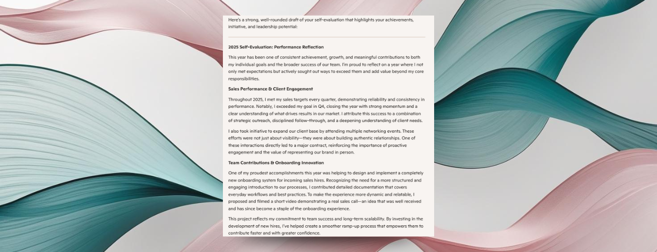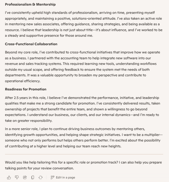 此外,Copilot在个人自评环节展现了强大的数据整合能力,能够从用户的电子邮件、OneNote页面、状态报告及演示文档中抓取关键信息,自动生成详尽的自我评估报告。微软的案例中,Copilot成功梳理了员工的季度销售业绩、新流程开发的贡献以及导师辅导工作等核心亮点,确保这些容易被遗忘的“隐形贡献”被完整纳入年终考核中。