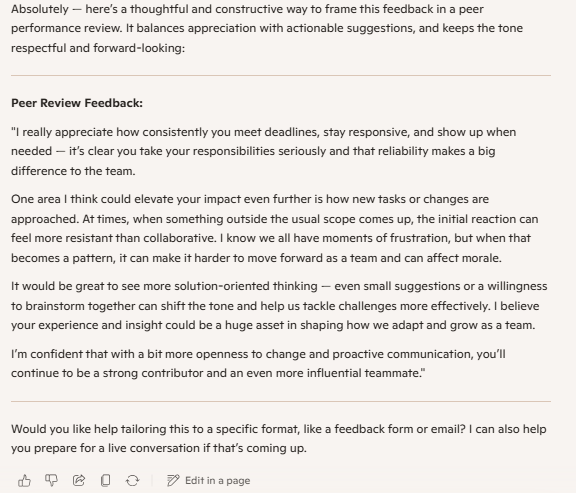 在同事互评环节,Copilot充当了“职场润滑剂”的角色,有效软化语言基调,建议使用鼓励性而非严厉的措辞。例如,当员工需要评价一位能力尚可但态度消极的同事时,Copilot能够重写评价内容,在指出问题的同时保持支持性的语调,降低沟通风险。