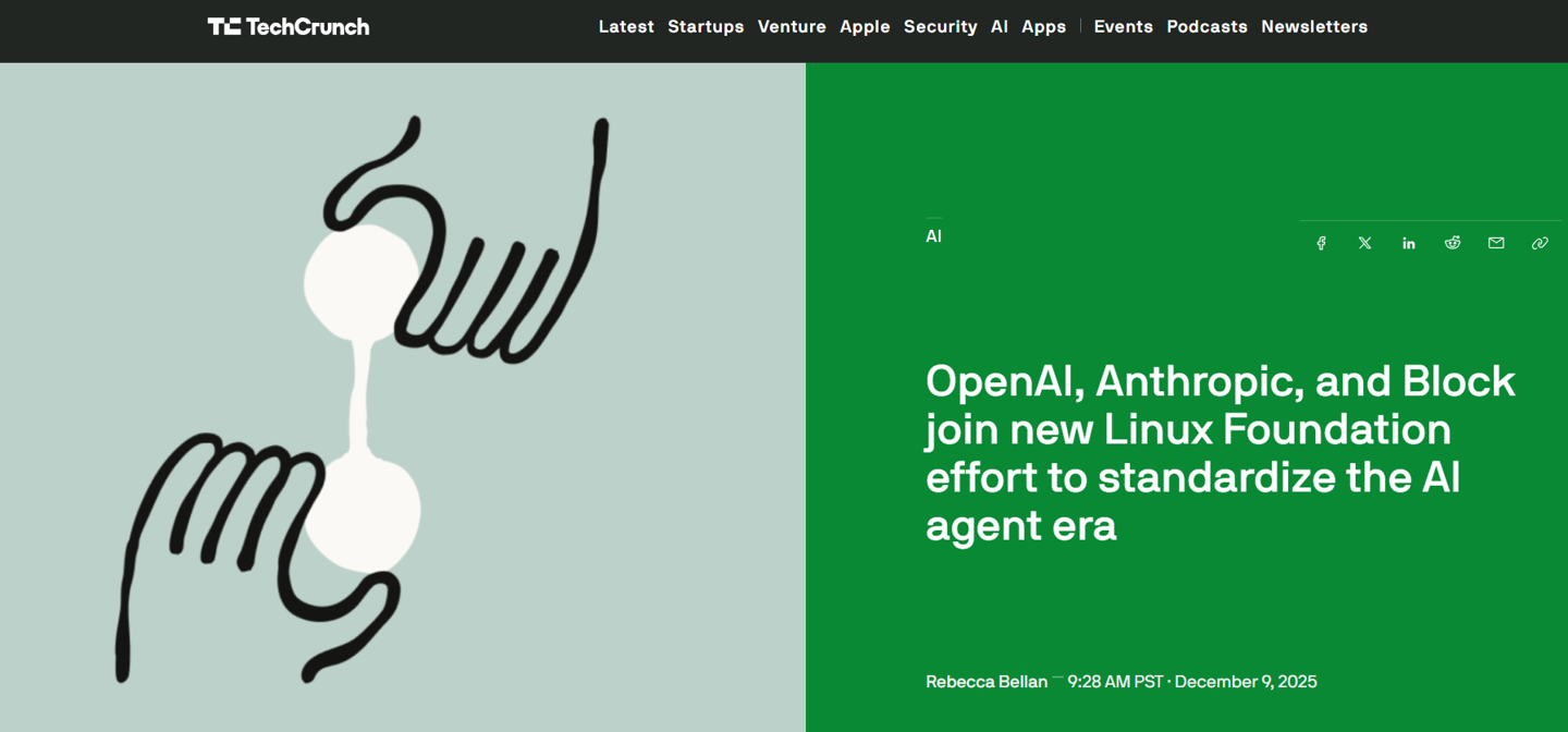 12月10日,Linux基金会宣布启动“AgenticAIFoundation”(AAIF),旨在防止AI智能体分裂成不兼容、封闭的产品。AAIF将作为AI智能体相关开源项目的中立组织,由Anthropic、Block和OpenAI的捐赠支持。Anthropic捐赠了模型上下文协议(MCP),Block贡献了Goose开源智能体框架,而OpenAI则带来了AGENTS.md文件,指导AI编码工具如何运作。这些捐赠项目均为AI智能体的基础设施。