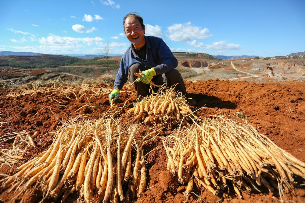 农户戴着手套,笑蹲其间,正梳理刚出土的党参,根长、须密,饱满鲜亮,丰收的喜悦与田园风光相融,满是生机。