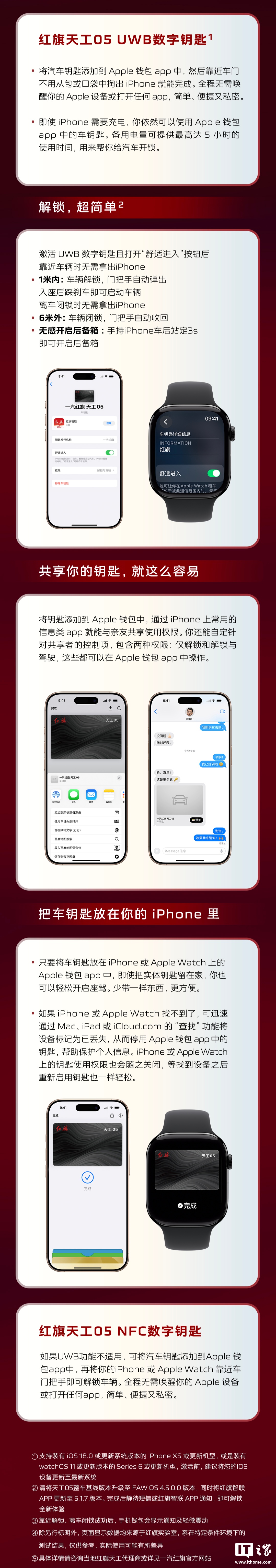 12月10日,一汽红旗宣布天工05车型新增苹果数字钱包UWB车钥匙功能,支持iPhone和Apple Watch解锁车辆。用户只需将汽车钥匙添加到Apple钱包App,即可实现靠近车门自动解锁,无需唤醒设备或打开任何App。此外,激活UWB车钥匙并打开“舒适进入”功能,用户在1米内车辆自动解锁,门把手弹出,踩刹车即可启动;6米外自动闭锁,门把手收回;手持iPhone站在车后3秒即可无感开启后备箱。