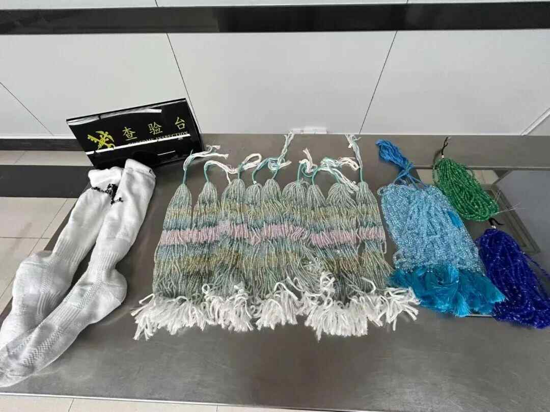 近日,广东深圳罗湖海关查获进境旅客双腿绑藏珠串330条。