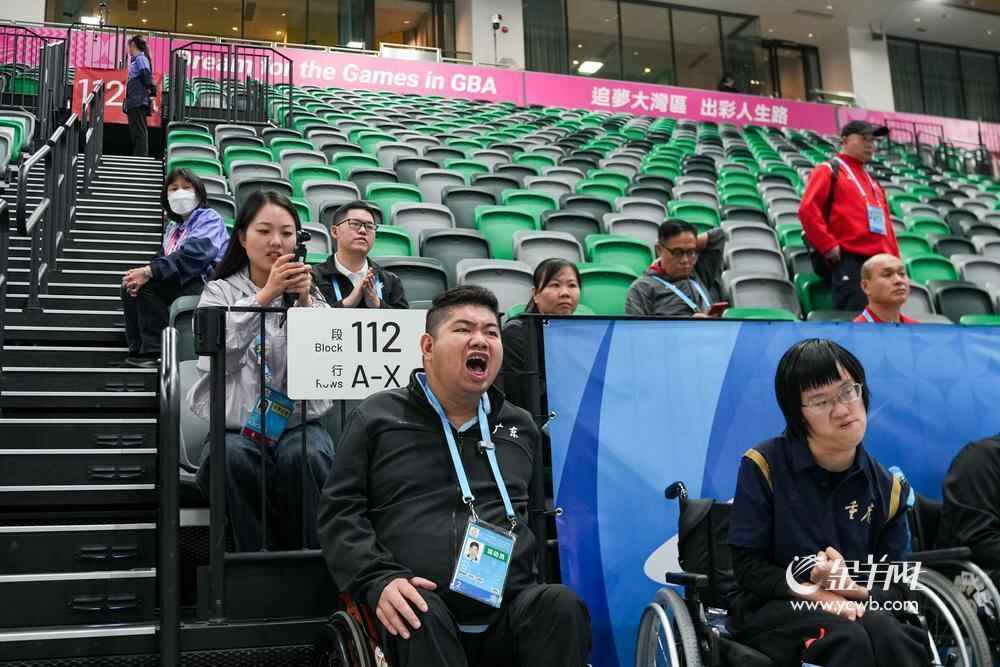 12月11日上午,香港启德体艺馆,残特奥会硬地滚球女子个人BC2级四分之一决赛正在举行。赛场边,坐在轮椅上观赛的郑远森目不转睛、喊声不断。他要用最大的声音为正在比赛的妻子广越楚加油。