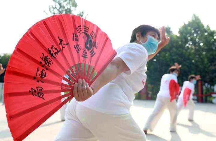 2022年6月11日,太极拳爱好者在河北省邢台市任泽区人民公园习练王其和太极扇。新华社记者 骆学峰 摄