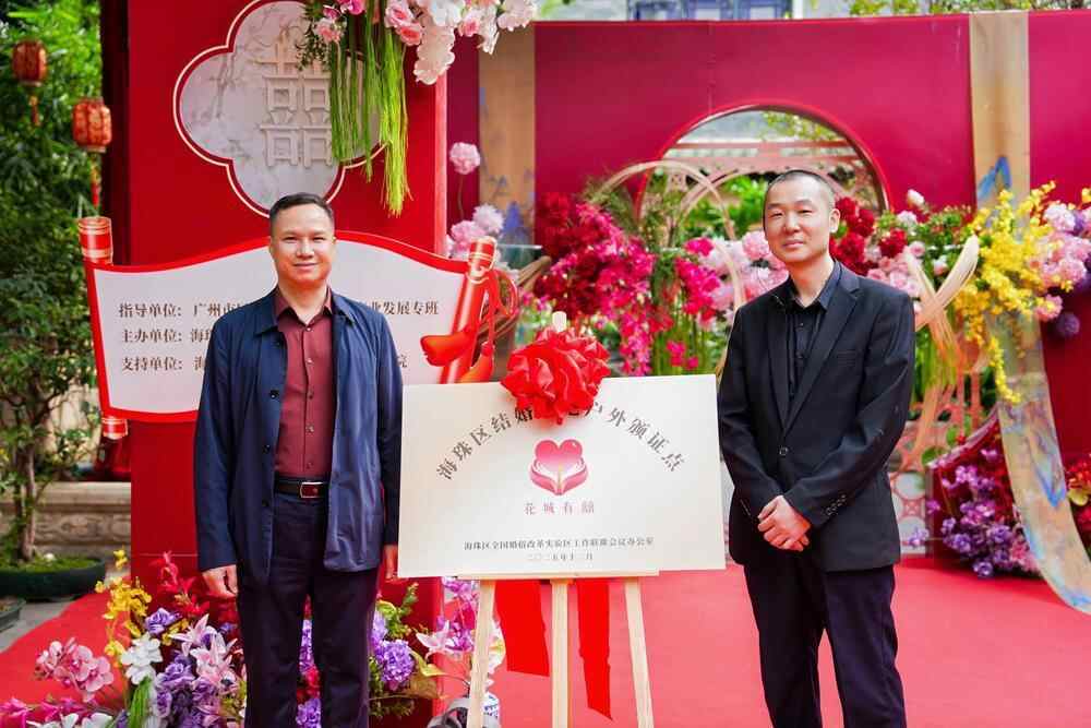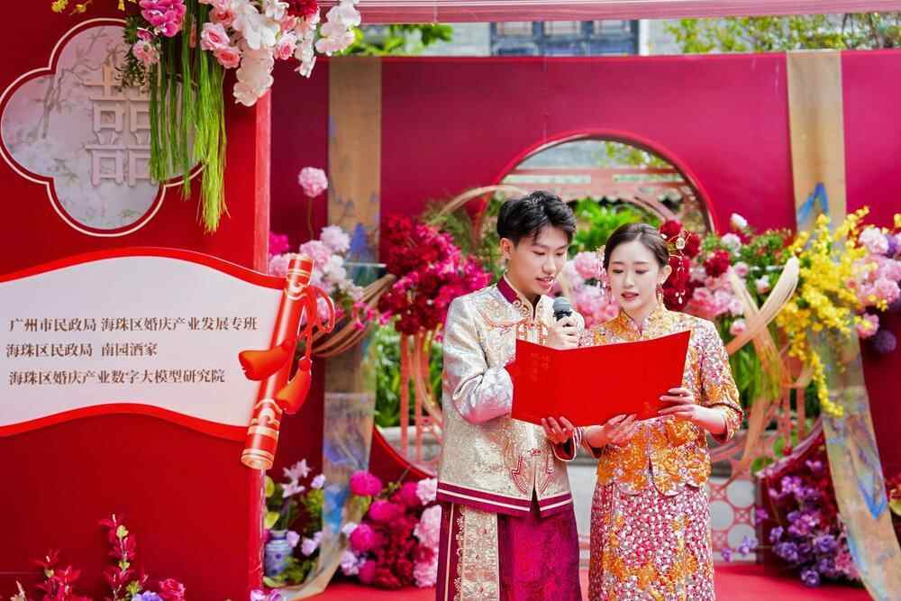 在12日当天,广州市民政局、海珠区婚庆产业发展专班、海珠区民政局、南园酒家、海珠区婚庆产业数字大模型研究院、南园酒家等单位负责人,共同为设在南园酒家的海珠区结婚登记户外颁证点进行揭牌;首批在南园酒家领取结婚证的新人,在酒家的园林景致中领取结婚证书,接受在场宾朋的美好祝愿。欢腾的醒狮表演将喜庆气氛推向高潮,新人在互动中接福纳祥,寓意美满生活自此启程。