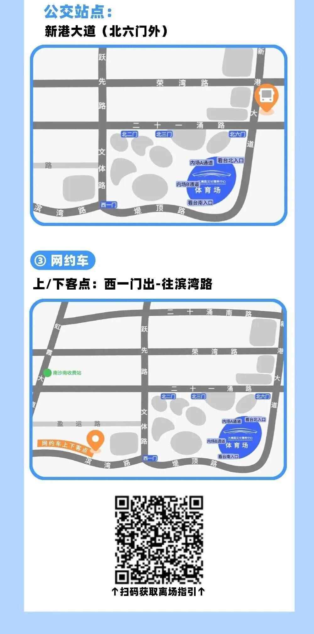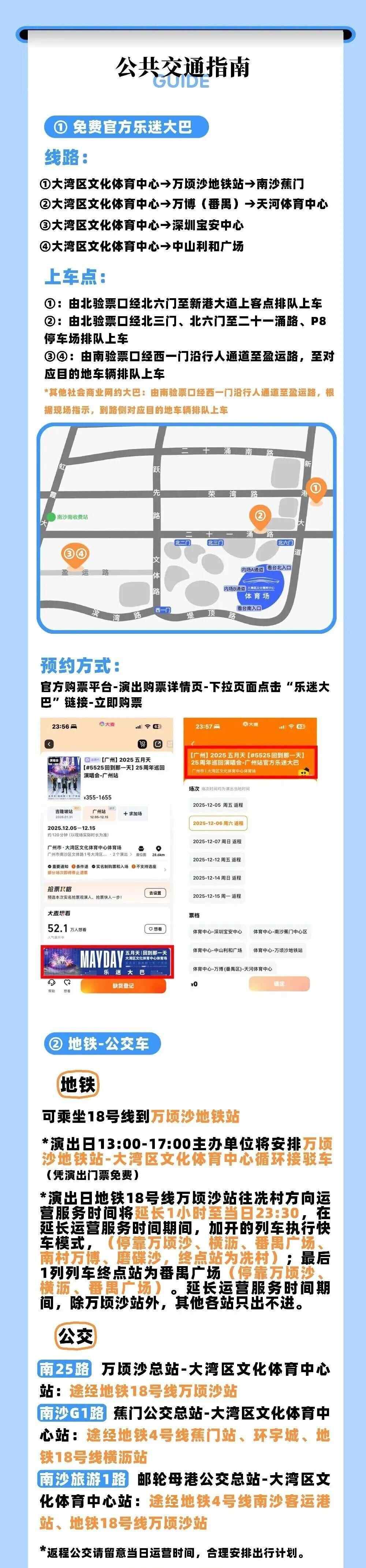 南沙公安交管部门提醒,乐迷可提前通过官方平台了解交通提示,尽量搭乘地铁、公交、专线接驳车等公共交通工具,并建议提前3小时抵达现场,预留充足验票安检时间。乐迷也可通过官方渠道查询接驳车频次与进场速度,以便合理规划行程。
