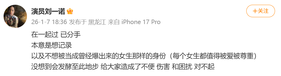 刚刚,@演员刘一诺 发文回应与檀健次恋情:“在一起过,已分手”。