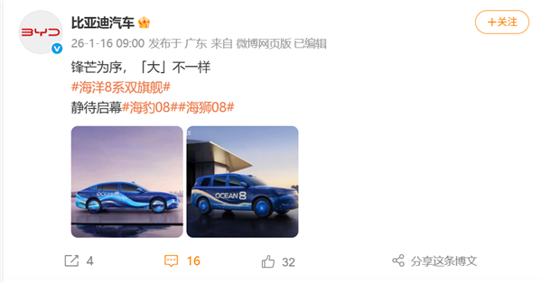 比亚迪海洋8系双旗舰车型计划于2026年第一季度正式亮相。在2025年12月的比亚迪海洋四周年OceanDay用户盛典活动中,比亚迪已正式官宣了这两款车型。此外,比亚迪还在1月10日的第二届王朝盛典暨宋Pro长续航发布会上宣布了王朝网的全新旗舰车型——唐9系、汉9系,计划于2026年上半年首发,冲击40万级高端市场。