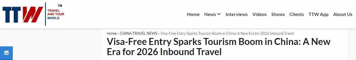 中国日报网1月16日电 2026年开年,中国入境游迎来强劲开局。数据显示,多地旅游目的地客流均呈现显著增长,适用免签政策入境的外国人达到29.2万人次,较去年同期增长35.8%。国际旅游行业媒体《旅行与旅游世界》网站(Travel And Tour World)持续关注中国蓬勃发展的旅游市场并在近日的报道中表示,在免签政策红利加持与国际连通性不断提升的双重推动下,中国的旅游格局正经历深刻转型,这一上升趋势亦凸显出中国作为全球旅游目的地的吸引力日益增强。