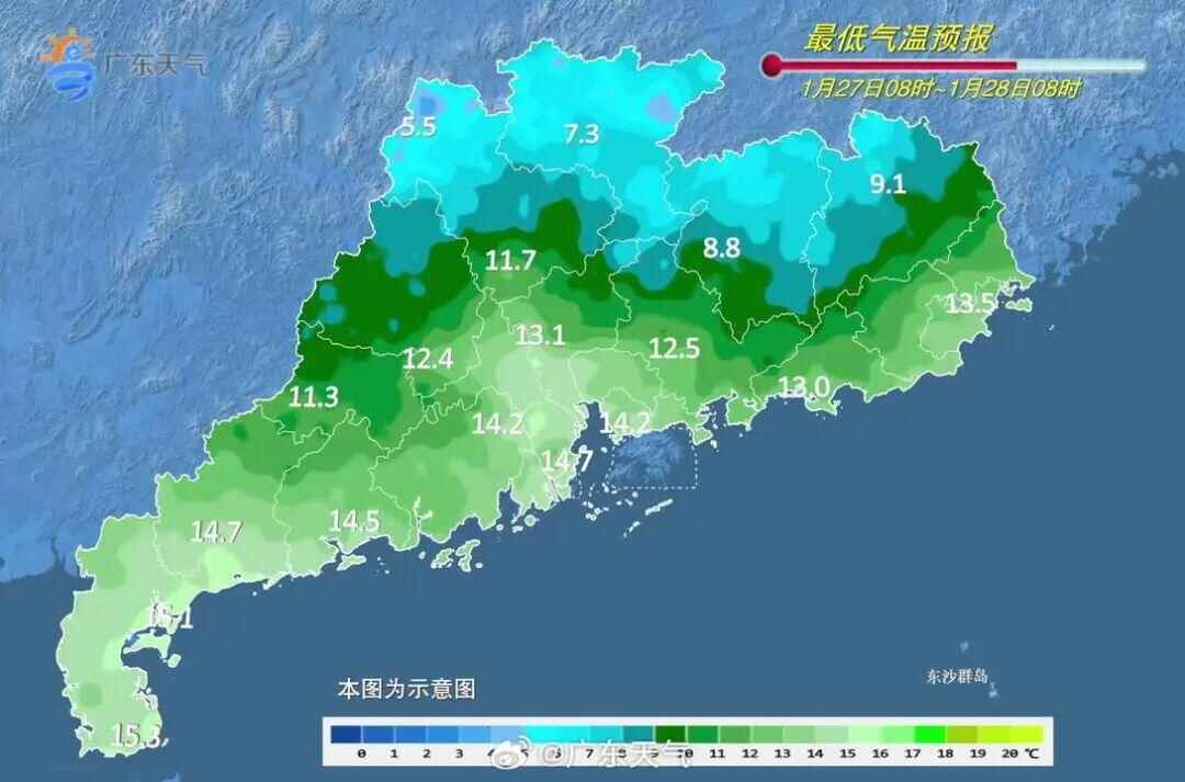28日,广东大部市县多云间晴天。最低气温:粤北偏北市县4℃~7℃,粤北偏南市县和珠江三角洲北部市县7℃~10℃,雷州半岛15℃~18℃,其余市县10℃~14℃。
