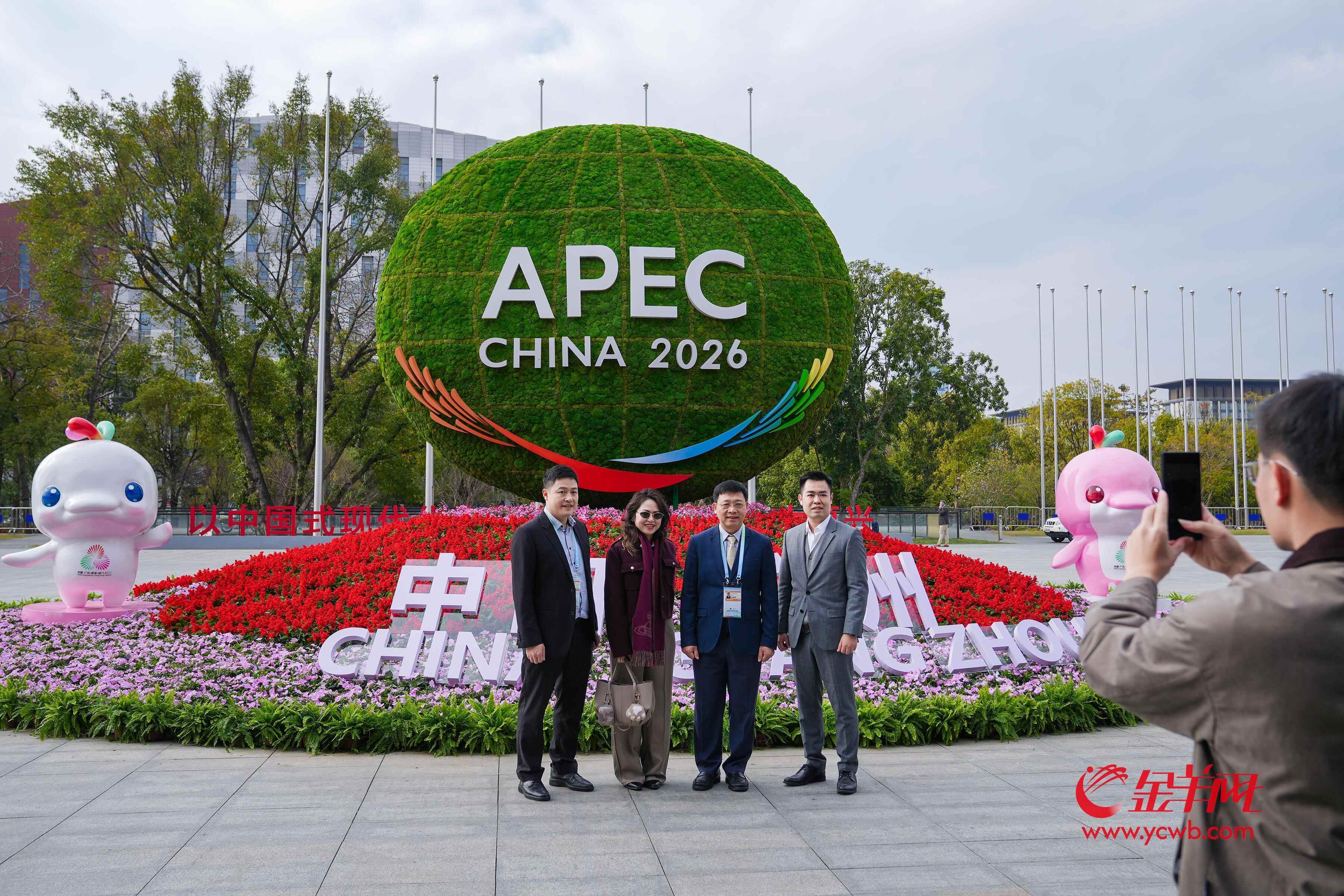 记者来到会场看到,会场外2026APEC“中国年”会标引人瞩目,备受大家喜爱的“大湾鸡”分立两旁,吸引了不少国内外嘉宾驻足留影。会场内蝴蝶兰、年桔等摆设喜气洋洋、年味十足,醒狮、广绣等“广州礼物”琳琅满目。